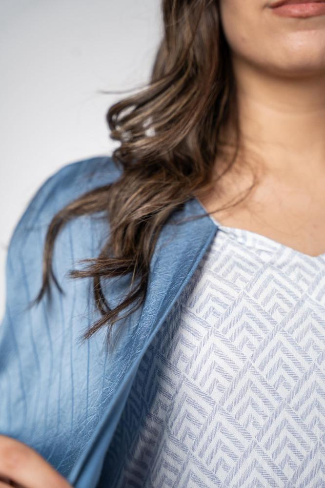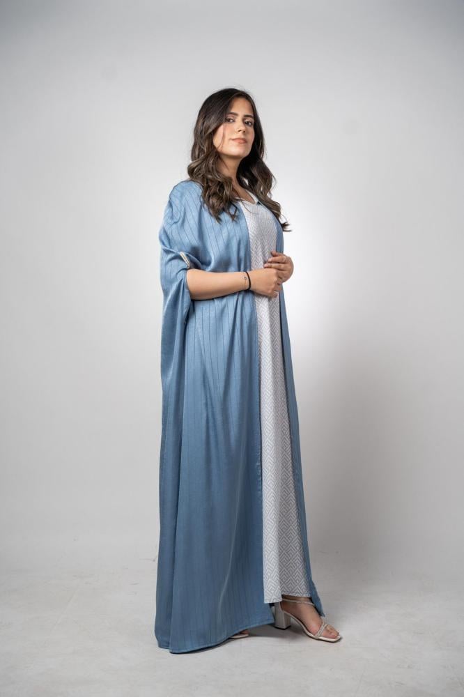 مفصله من قماش أزرق سماوي فاخر ينساب بنعومة، ومع فستان داخلي أبيض منقوش بنقشة هندسية تزيده رقي وأناقة. قطعة كلاسيكية تعكس حضورك الهادئ والمترف، مناسبة لكل مناسباتك اليومية والسهرة المسائية.