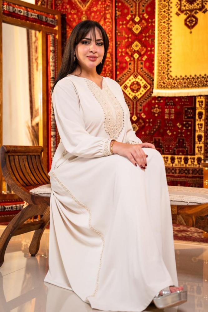 جلابية فاخرة قماش كريب كوري بتطريز ذهبي يخطف الأنفاس، تصميم المصممة السعودية الجوهرة البدر، تجمع بين الراحة والرقي بأسلوب يخليك تتألقين كل يوم وكأنك في مناسبة. جمالها يأسرك .
