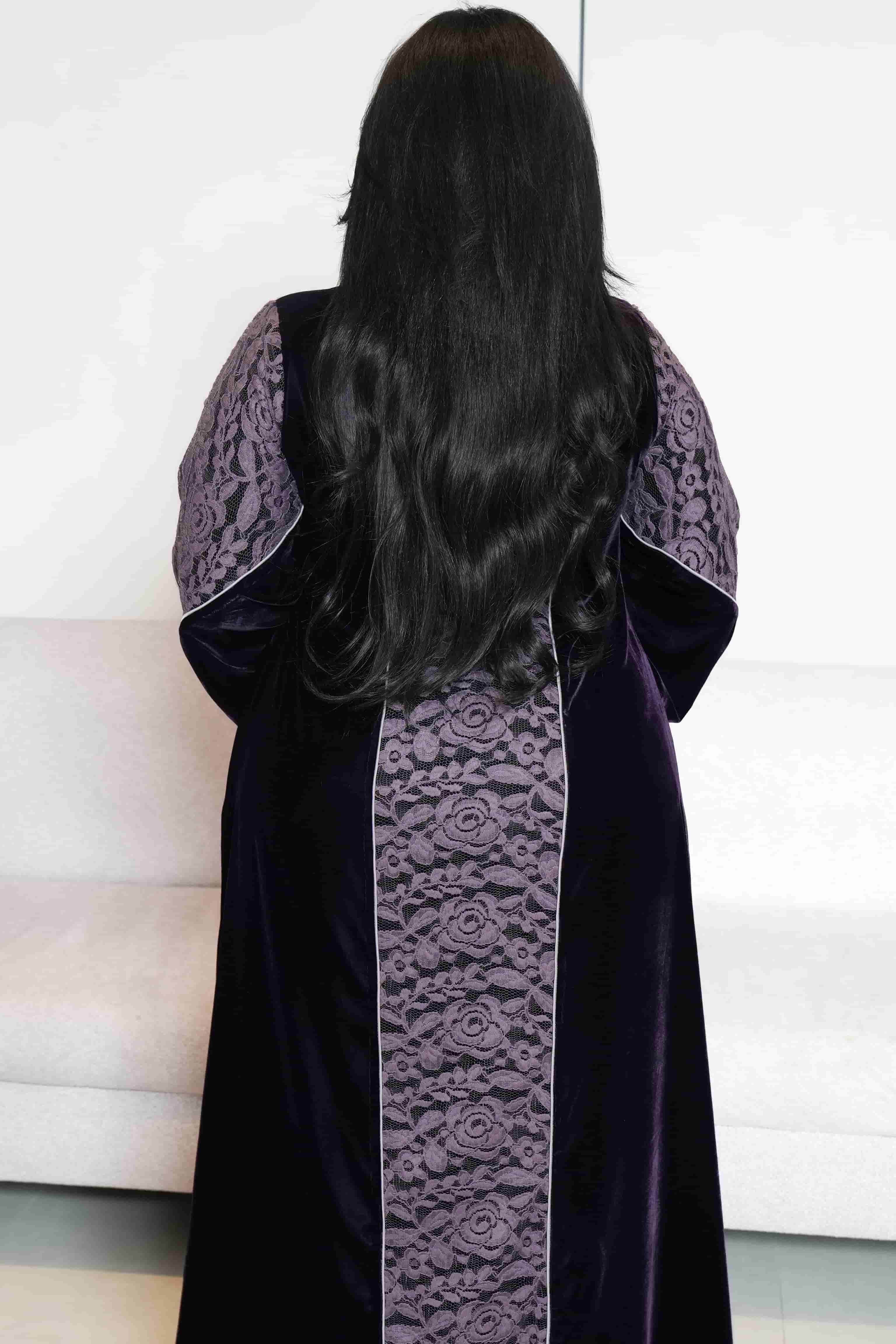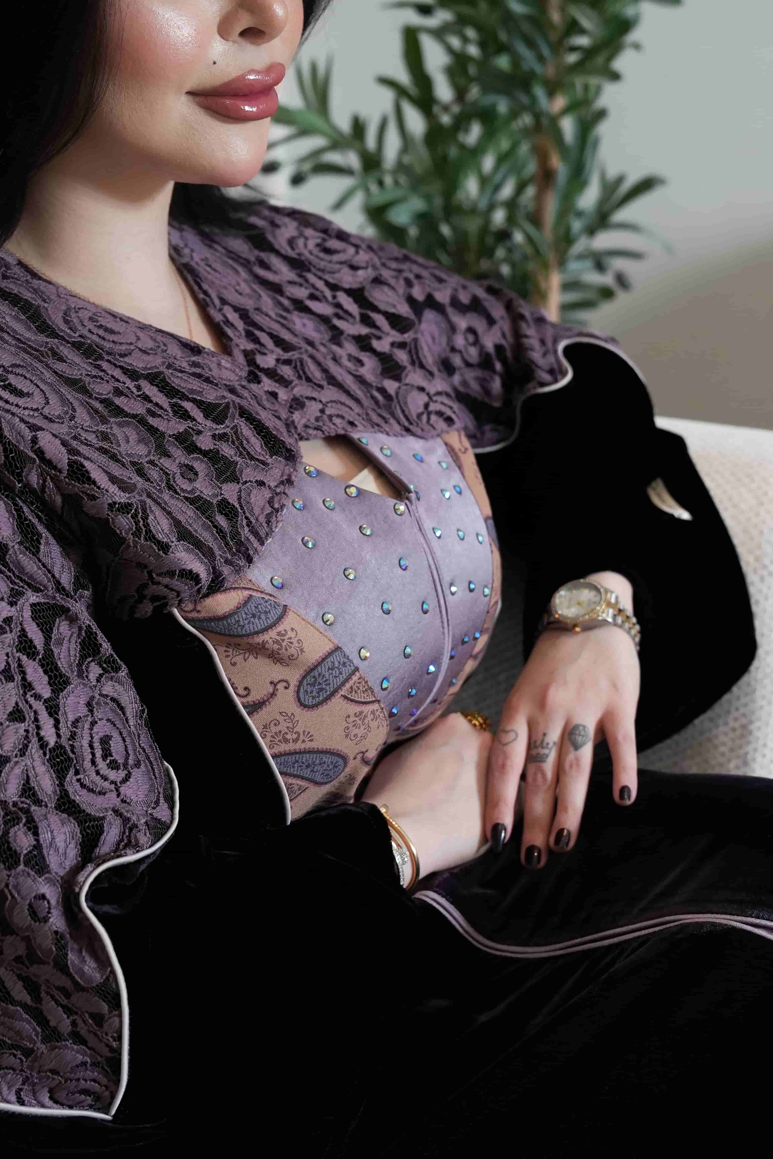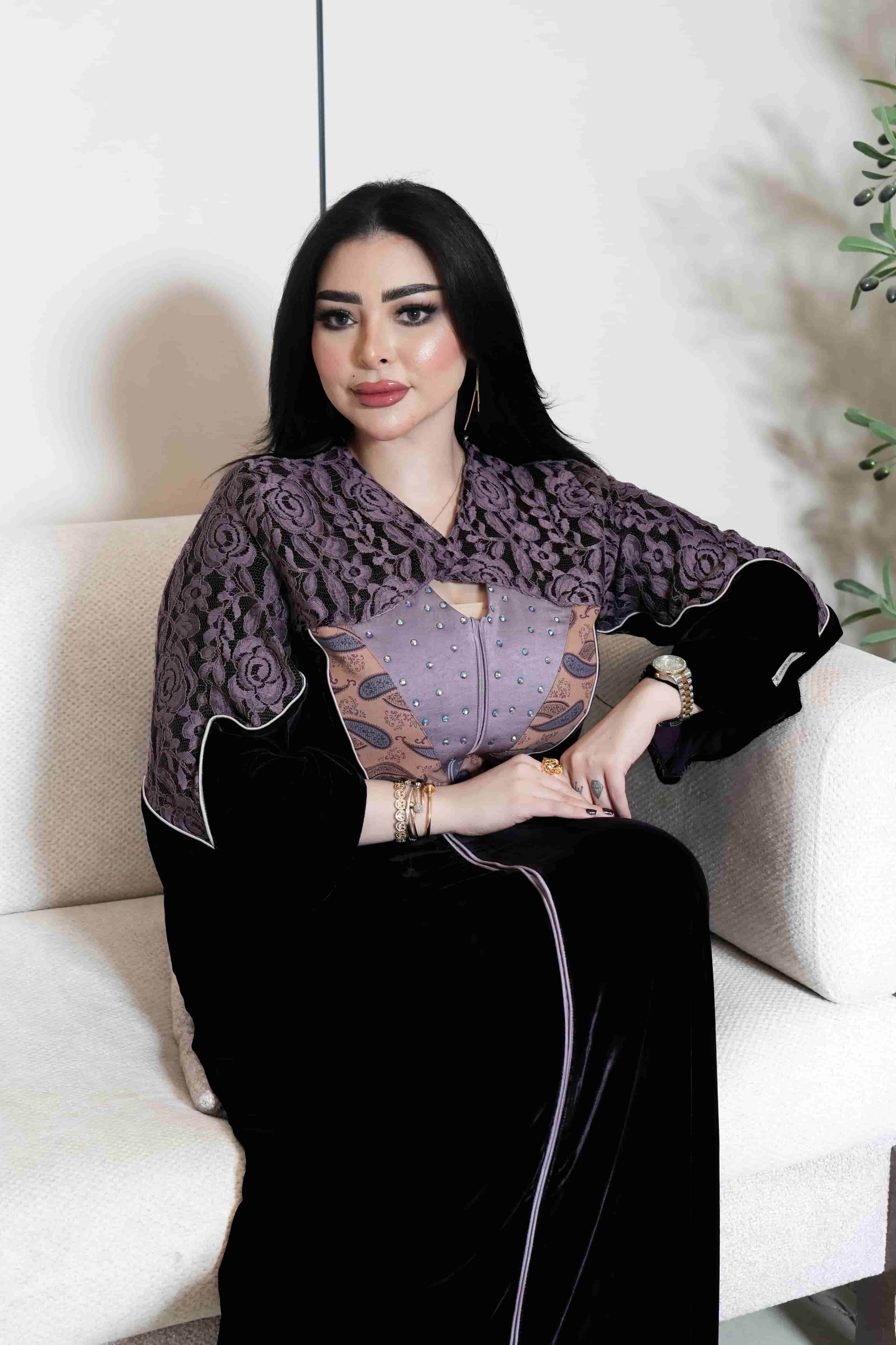 الأكمام واسعة بانسيابية أنيقة، وقصّة الصدر ناعمة متدرجة تمنح توازن بين الرقي والأنوثة