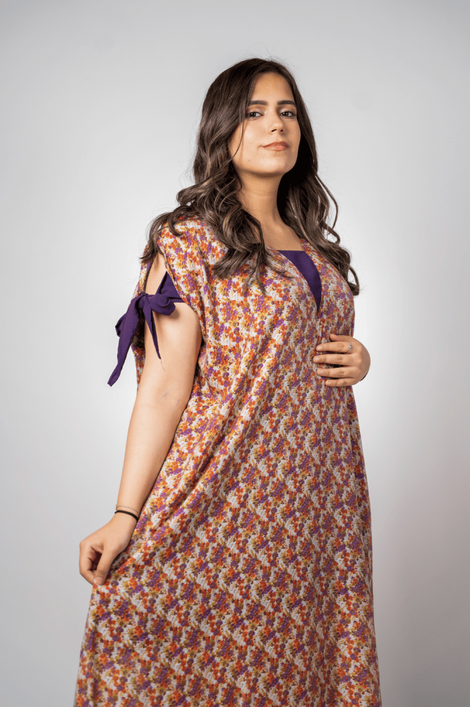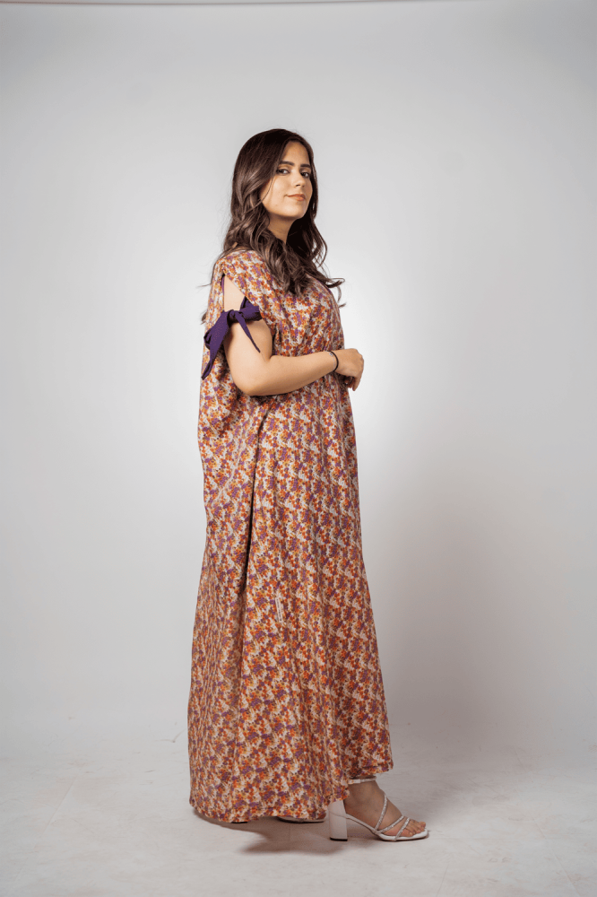 تصميم يزهو بألوان مستوحاة من الزهور ولمسات البنفسج الساحرة، على قماش ناعم وخفيف ينساب برقة على الجسم. تفاصيل مبتكرة ترسم جمال الكتف وتمنح إطلالة أنثوية آسرة، من إبداع المصممة السعودية الجوهرة البدر