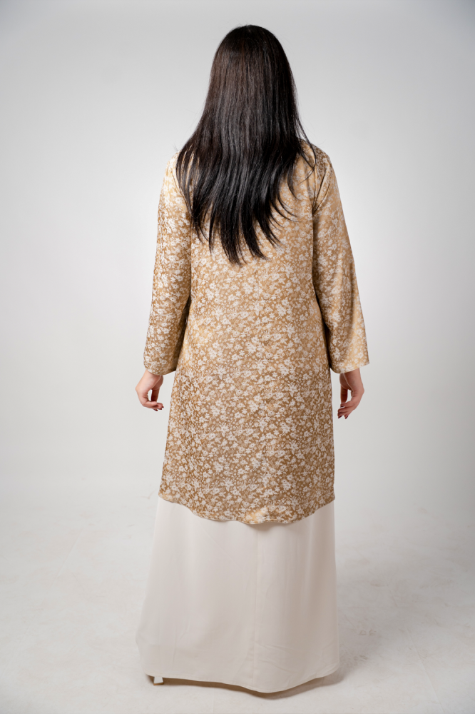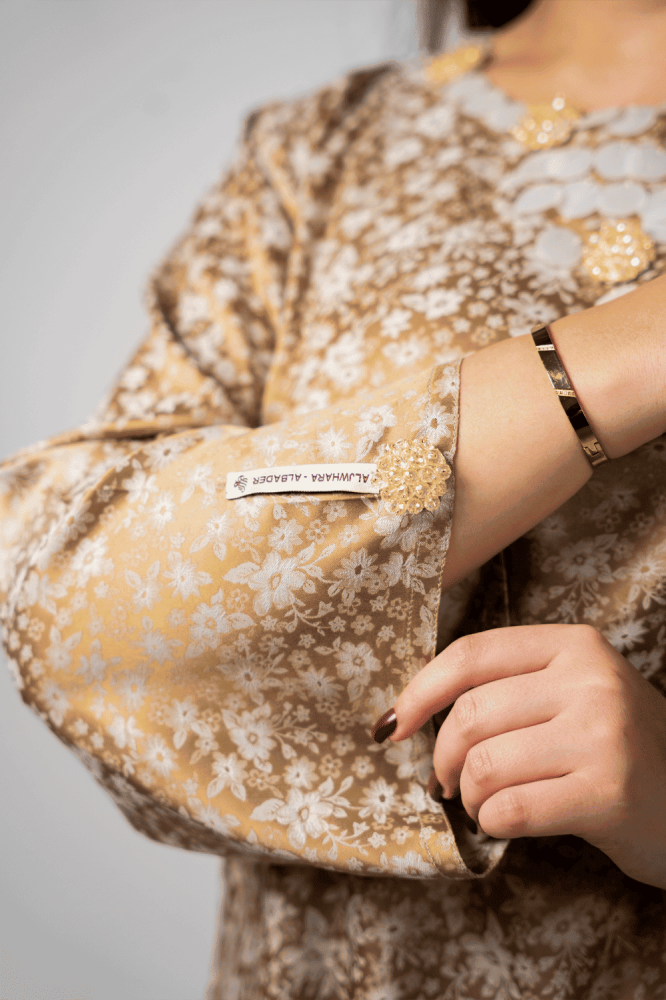 جلابية تحمل بصمة فنية ناعمة، تنسج خيوط الذهب مع لمسات الزهور الصغيرة في لوحة أنثوية آسرة. الصدر يزدان بكريستالات أنيقة تضيف بريقًا راقياً، بينما ينساب التصميم على شكل قطعتين متناغمتين تمنح حضوراً متوازناً بين الفخامة والبساطة. إبداع المصممة الجوهرة البدر يجعل هذه القطعة خيارًا نادراً لكل امرأة تبحث عن إطلالة تفيض أنوثة ورقي