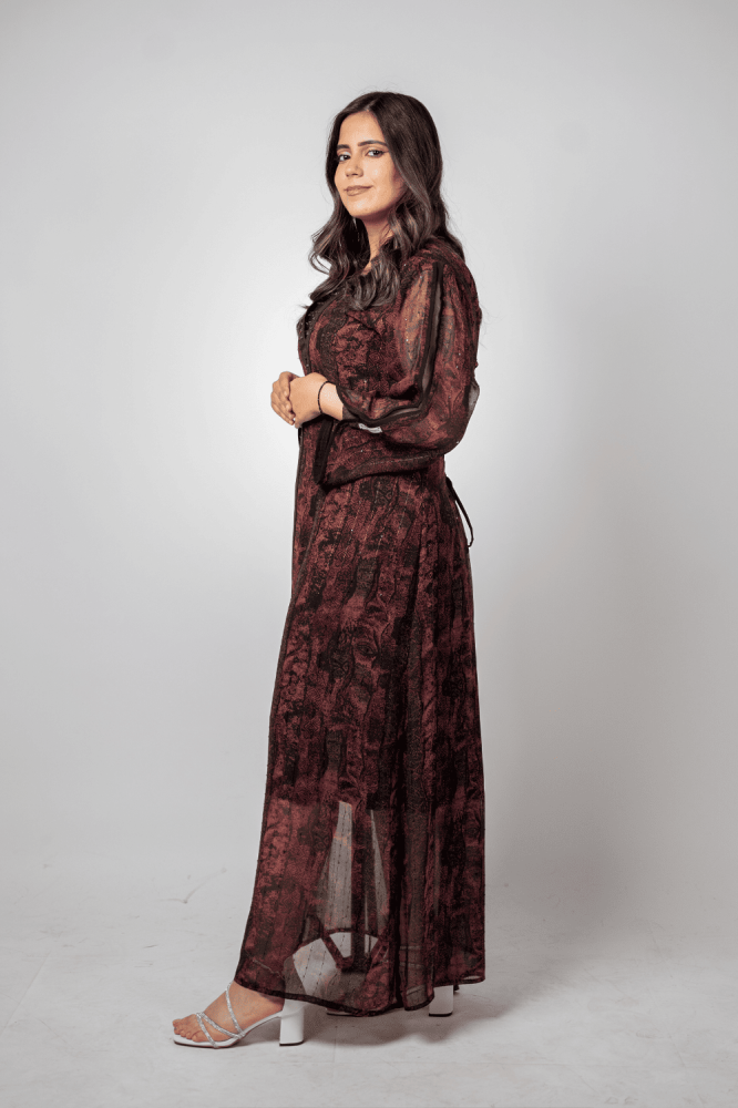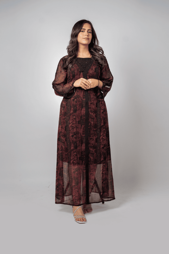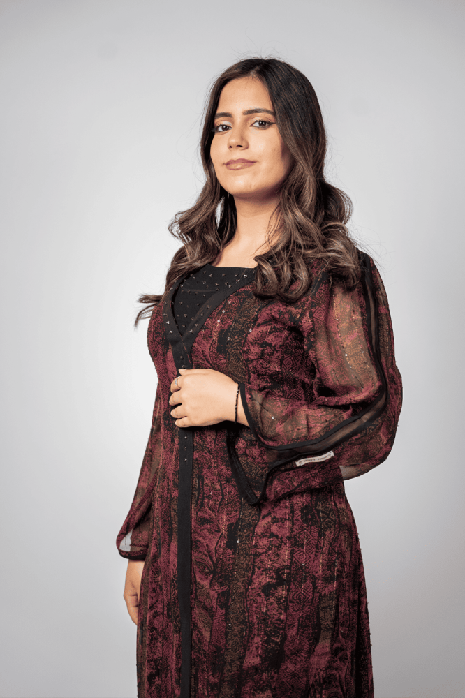 جلابية آسرة بتوقيع المصممة السعودية الجوهرة البدر، تنساب بأناقة لون البرغندي العميق ونوع الشيفون الراقي مع كريب على الصدر مطعم بالشك الناعم . وتصميمها المتقن لتبرز جمال المرأة وتغلفها بسحرٍ أنثوي لا يُقاوم، لتكون القطعة التي تتحدث عن فخامتك قبل حضورك