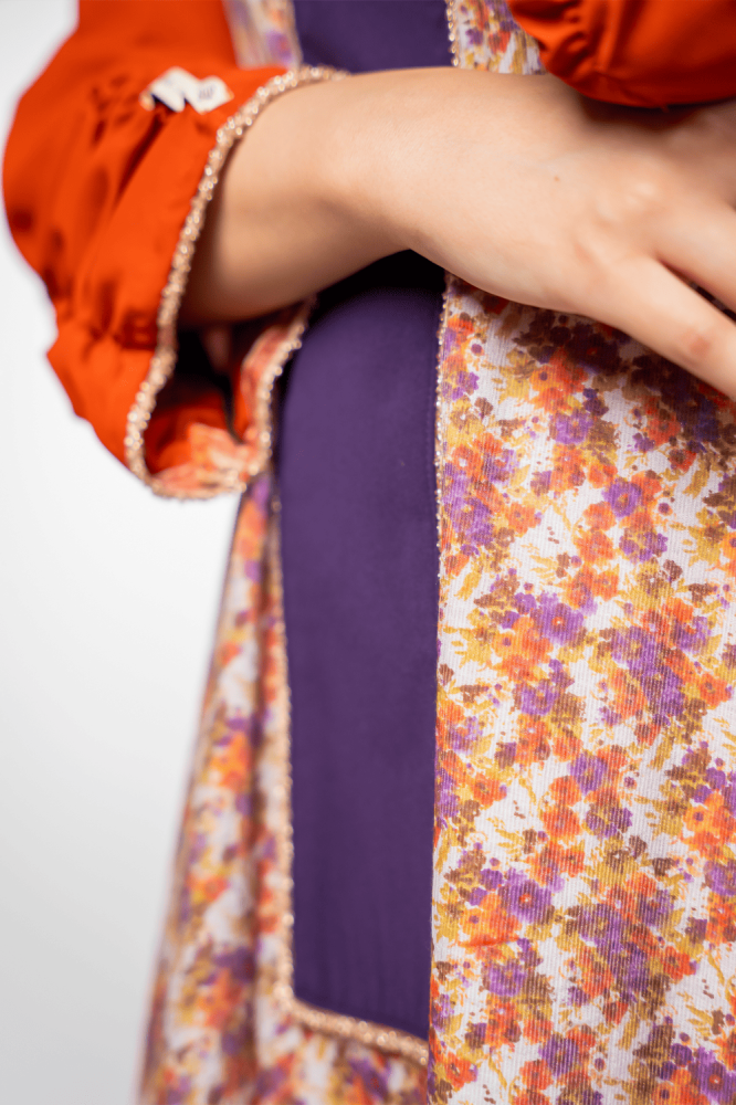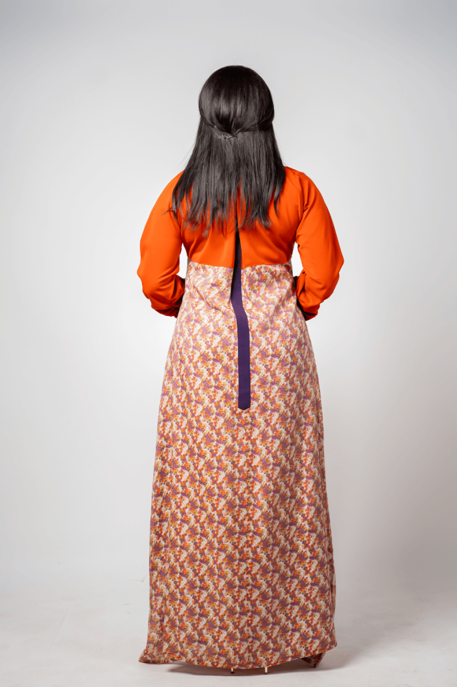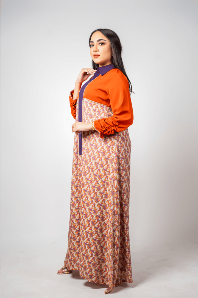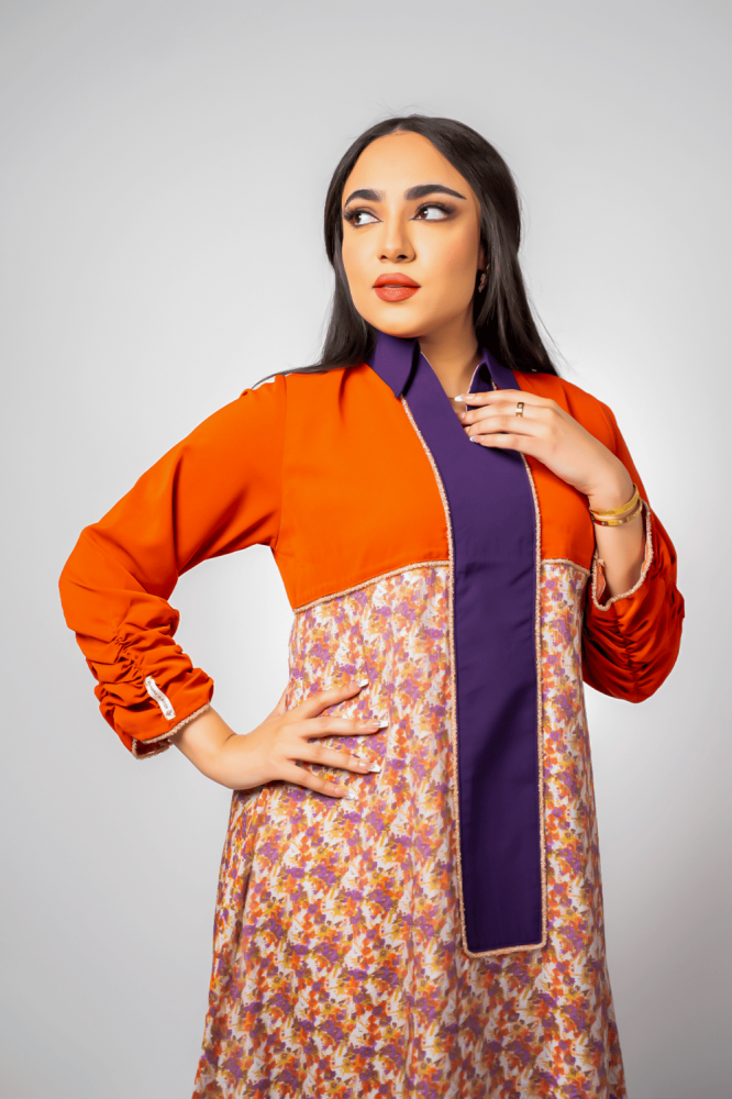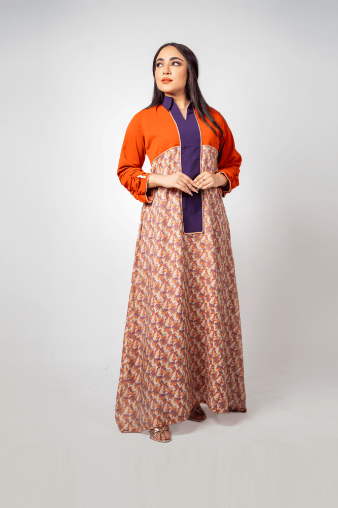 تحفة أنثوية تفيض بالفخامة، بتصميم رقبة مبتكر يخطف الأنظار ويبرز جمال الملامح، امتزج فيه البرتقالي الدافئ مع البنفسجي العميق في تناغم يروي قصة ذوق راقٍ. القماش بطبعات زهرية مبهجة تضيف لمسة حياة وأناقة، والتفاصيل الدقيقة تحاكي إبداع المصممة السعودية الجوهرة البدر، لتكون الجلابية قطعة تليق بذوقك وتفردك