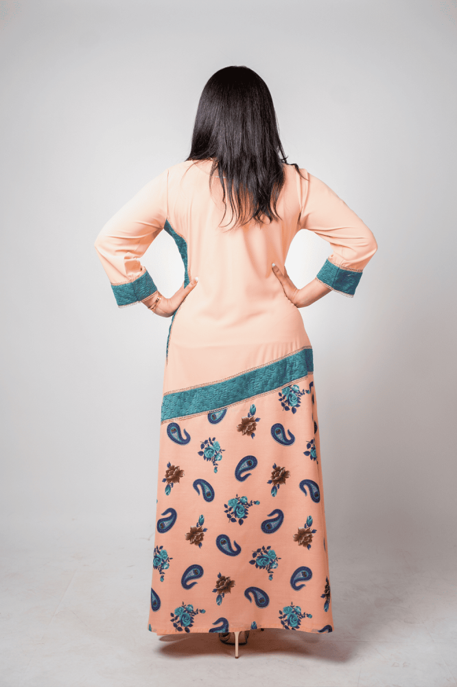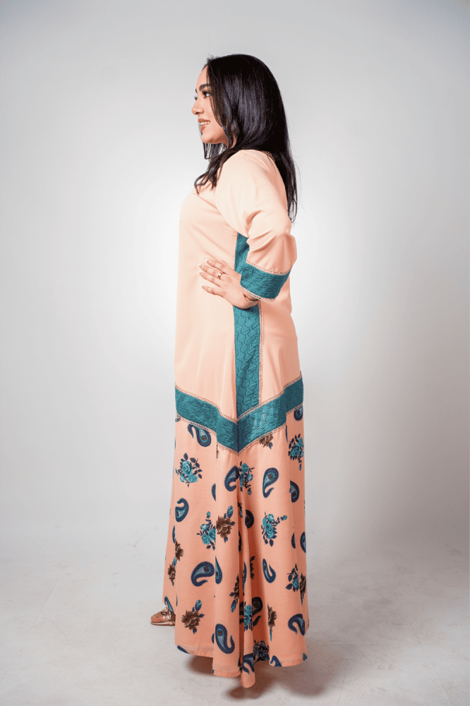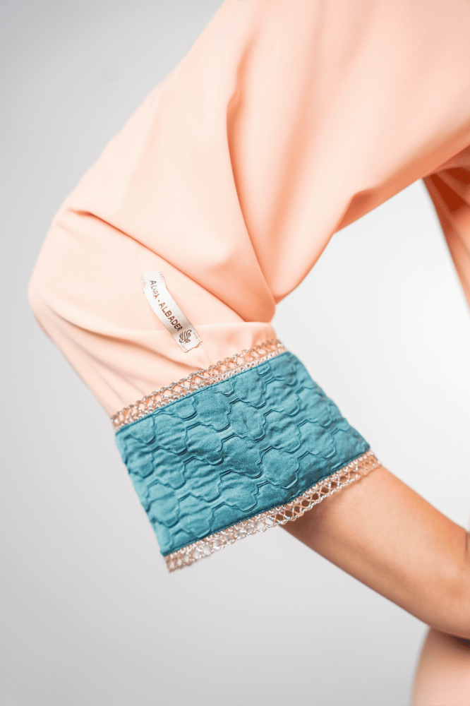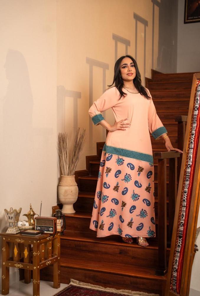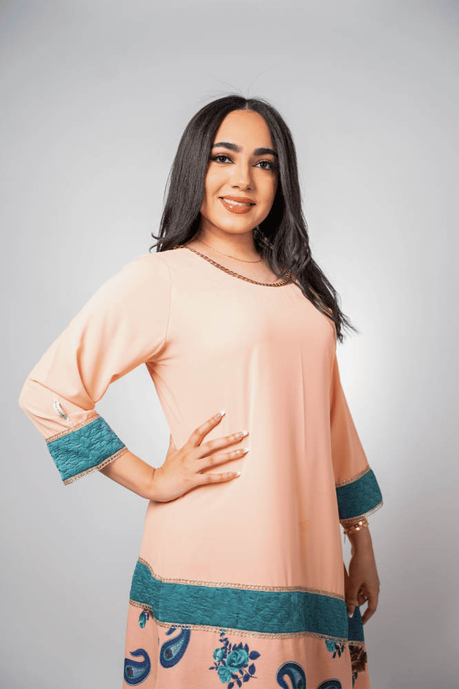 جلابية ناعمة بألوان راقية من نوع قماش كريب كوري وتفاصيل فيروزية فخمة، مع نقوش أنثوية تضيف لمسة دلال وجاذبية. تصميم مريح وأنيق يليق بكل مناسبة، ويجعل حضورك أبهى وأجمل في كل لحظة.