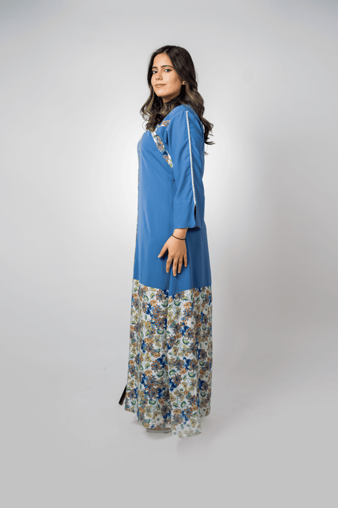 جلابية فاخرة بتوقيع المصممة السعودية الجوهرة البدر، تنبض بالأزرق الملكي وتزدان بنقوش أزهار ساحرة على قماش فاخر يروي قصة أناقة لا تُنسى. تصميم يجمع بين الفخامة العصرية والأصالة، ليمنحك إطلالة تشبه البراندات العالمية