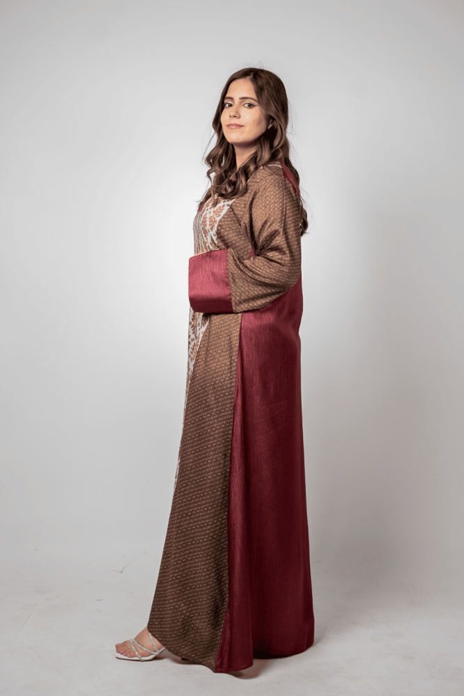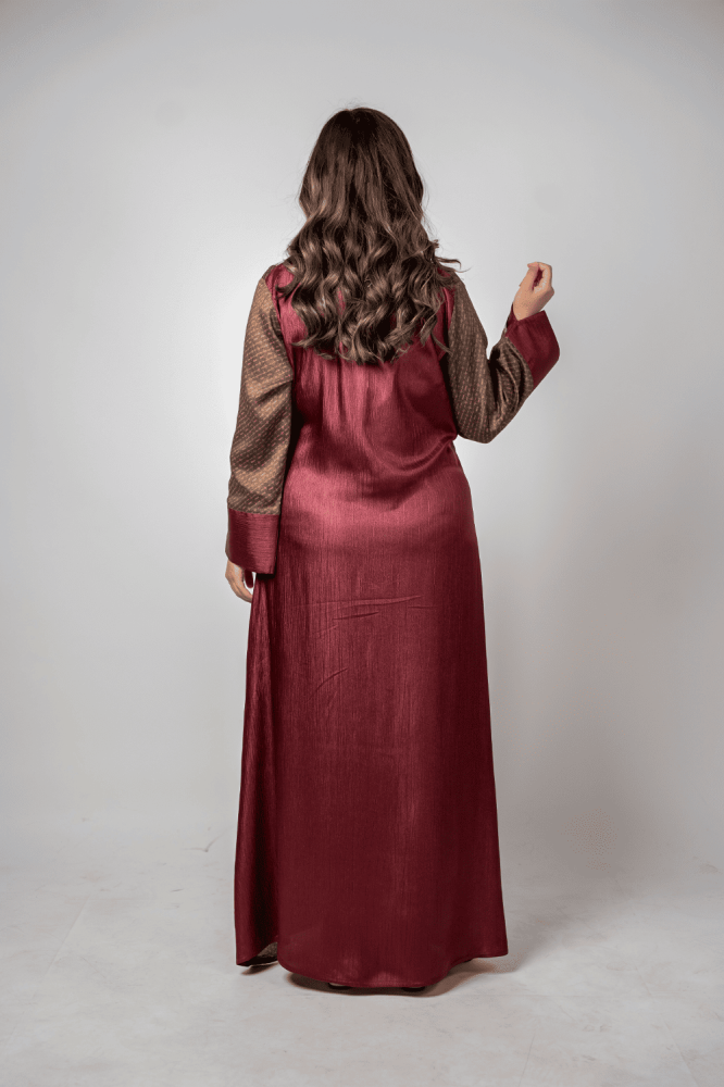 جلابية فاخرة تجمع بين فخامة المارون العميق ونقوش من القطن الهندي الفاخر تصميمها المميز يبرز بخطوطه الانسيابية وتفاصيل الأكمام ليمنحك حضورًا أنيقًا يليق بالمناسبات الخاصة. إبداع المصممة الجوهرة البدر يتجلى في كل خيط، لتكوني أيقونة ذوق رفيع وأناقة بلا حدود